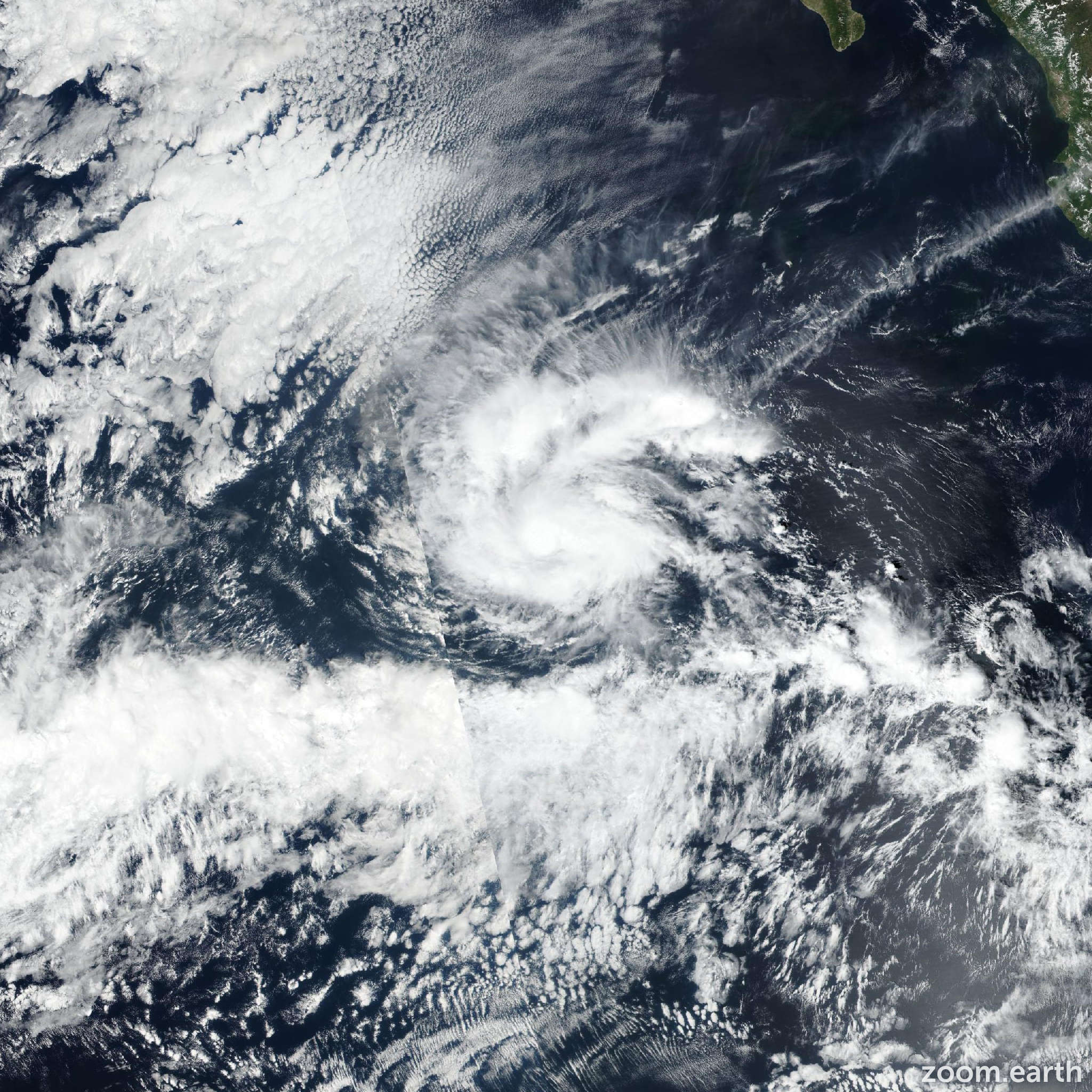 L’imagerie satellitaire géostationnaire révèle la formation périodique de zones de convection près du centre de la dépression, avec une large bande nuageuse s’enroulant sur son flanc nord. L’estimation subjective, basée sur la technique Dvorak, maintient l’indice à T2.0. Par conséquent, l’intensité initiale de 35 mph (environ 56 km/h, soit 30 nœuds) est conservée pour le présent avis.