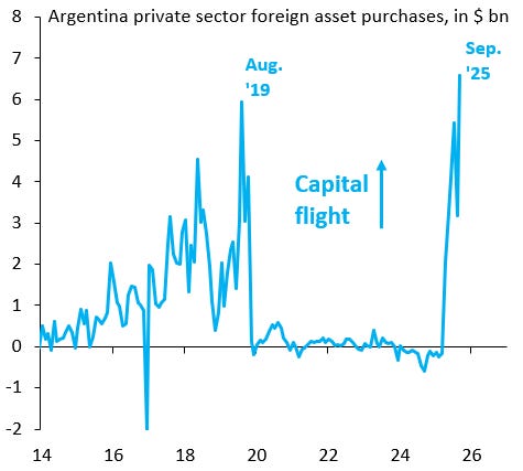 Les données publiées par la Banque Centrale argentine illustrent l’ampleur du phénomène. Un graphique récent suggère que la fuite des capitaux en septembre 2025 aurait déjà surpassé le pic d’août 2019, une période synonyme de déroute pour le président Macri. Si la tendance se confirme avec les données d’octobre, cet épisode pourrait s’avérer encore plus grave que le précédent. Les analystes soulignent qu’un laisser-faire plus précoce du taux de change, avant les élections, aurait potentiellement freiné cette fuite en éliminant l’anticipation d’une dévaluation. La stratégie actuelle de maintenir l’ancrage, semble donc directement liée à l’aggravation de la sortie des capitaux.