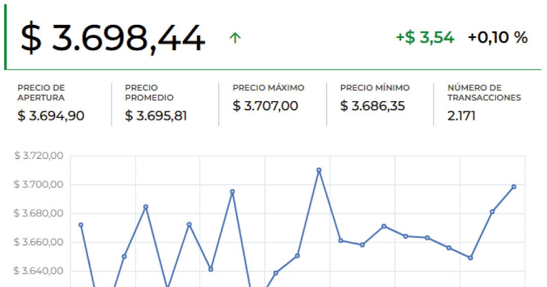 La devise américaine a terminé la séance en territoire négatif, à 3 691,57 $, marquant une baisse de 4,15 $ par rapport au taux de référence (TRM) de 3 695,72 $. Les transactions ont atteint un volume de 1 838 opérations, représentant 1 374 millions de dollars américains, avec un plus haut à 3 717,50 $ et un plus bas à 3 667 $.