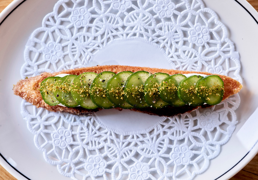 - Ce mets, conçu pour être partagé, est garni de pollen de fenouil et servi avec des concombres légèrement acidulés.