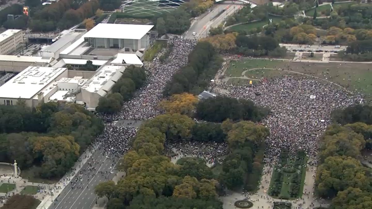 Depuis Grant Park, où le rassemblement principal s’est tenu, l’hélicoptère Sky 5 de NBC Chicago a capturé des images aériennes impressionnantes, montrant la foule dense venue manifester contre ce qu’ils perçoivent comme une approche répressive de l’immigration et une dérive autoritaire du président américain. La manifestation, surnommée « Ne touchez pas à Chicago », visait à dénoncer directement les actions de Donald Trump et sa rhétorique.