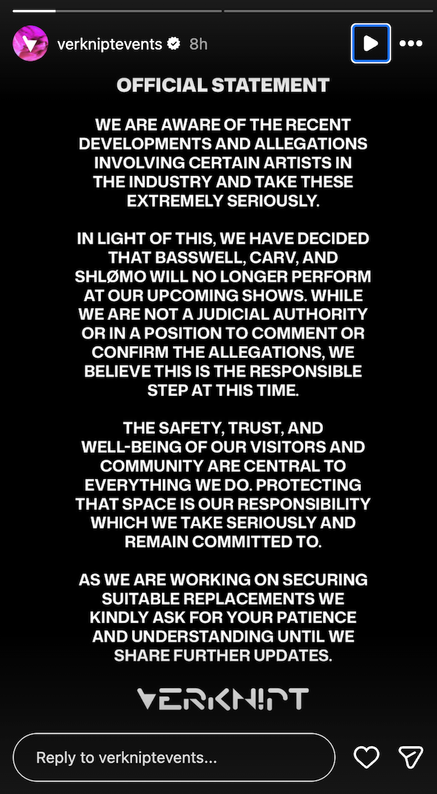 Les organisateurs d’événements ont rapidement réagi. Le promoteur indien Subvolt a été le premier à annuler la performance de Shlømo à Mumbai le 21 février, invoquant les « graves allégations » qui circulent. Le festival marseillais Le Bon Air a suivi le mouvement. Le club néerlandais MESSÉ a quant à lui retiré Shlømo, Basswell et CARV de sa programmation, tandis que Shlømo et Basswell ont également été retirés de l’affiche du festival allemand Open Beatz. Basswell a également vu ses concerts au club berlinois OST et au club brésilien Sous Division annulés. Odymel ne se produira plus au festival australien Presentation Music and Arts.