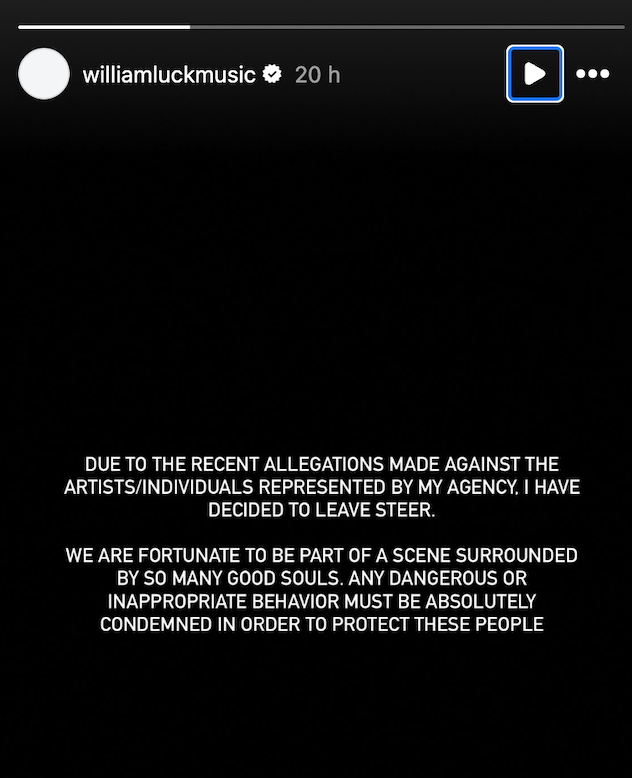 Suite à ces révélations, plusieurs artistes associés à Steer Management, dont William Luck, 6EJOU, ECZODIA, Onlynumbers et Natte Visstick, ont annoncé la fin de leur collaboration avec l’agence. William Luck a déclaré sur les réseaux sociaux : « Nous avons la chance de faire partie d’une scène entourée de tant de bonnes âmes. Tout comportement dangereux ou inapproprié doit être absolument condamné afin de protéger ces personnes. »