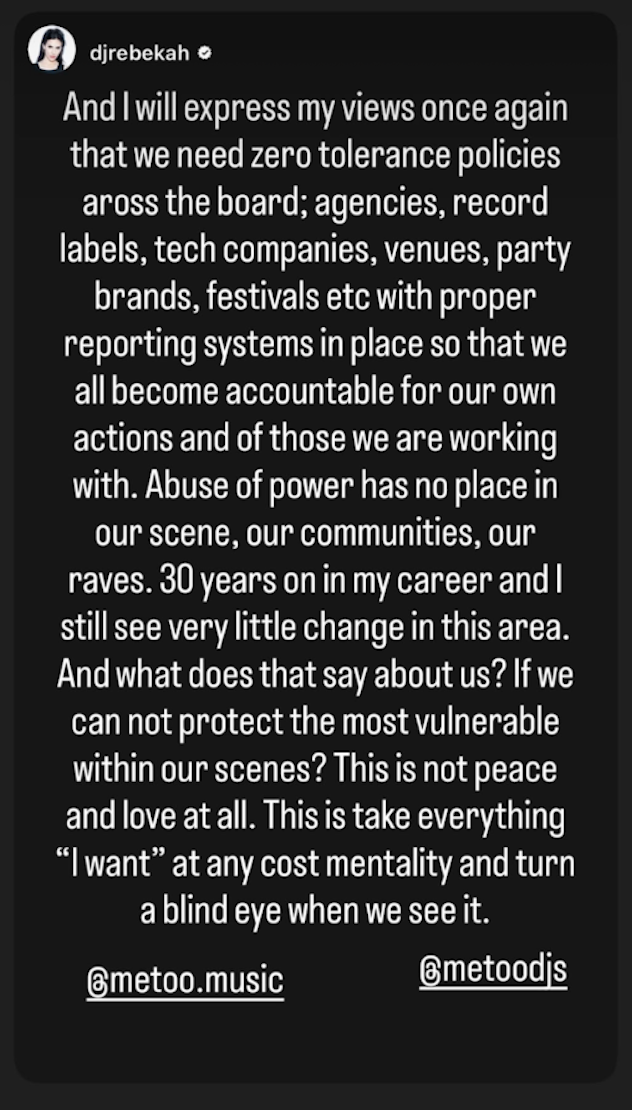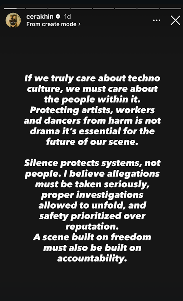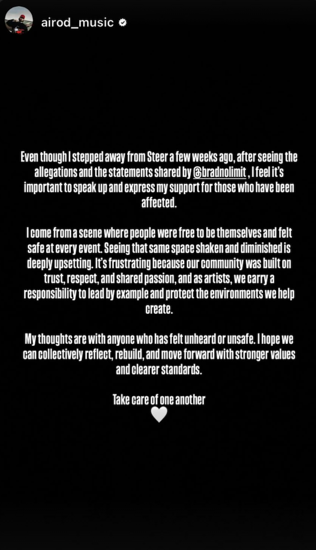 D’autres figures de la scène hard techno ont également pris position. Cera Khin a souligné sur Instagram Stories que les accusations de cette nature « doivent être prises au sérieux, des enquêtes appropriées doivent être autorisées et la sécurité doit primer sur la réputation ». Airod, qui avait quitté Steer avant que les accusations ne soient rendues publiques, a exprimé son « soutien à ceux qui ont été touchés », tandis que Rebekah, une défenseure de longue date de Steer, a appelé à la mise en œuvre de « politiques de tolérance zéro » à tous les niveaux, affirmant : « L’abus de pouvoir n’a pas sa place dans notre scène, nos communautés et nos raves. J’ai 30 ans de carrière et je vois encore très peu de changements dans ce domaine. »