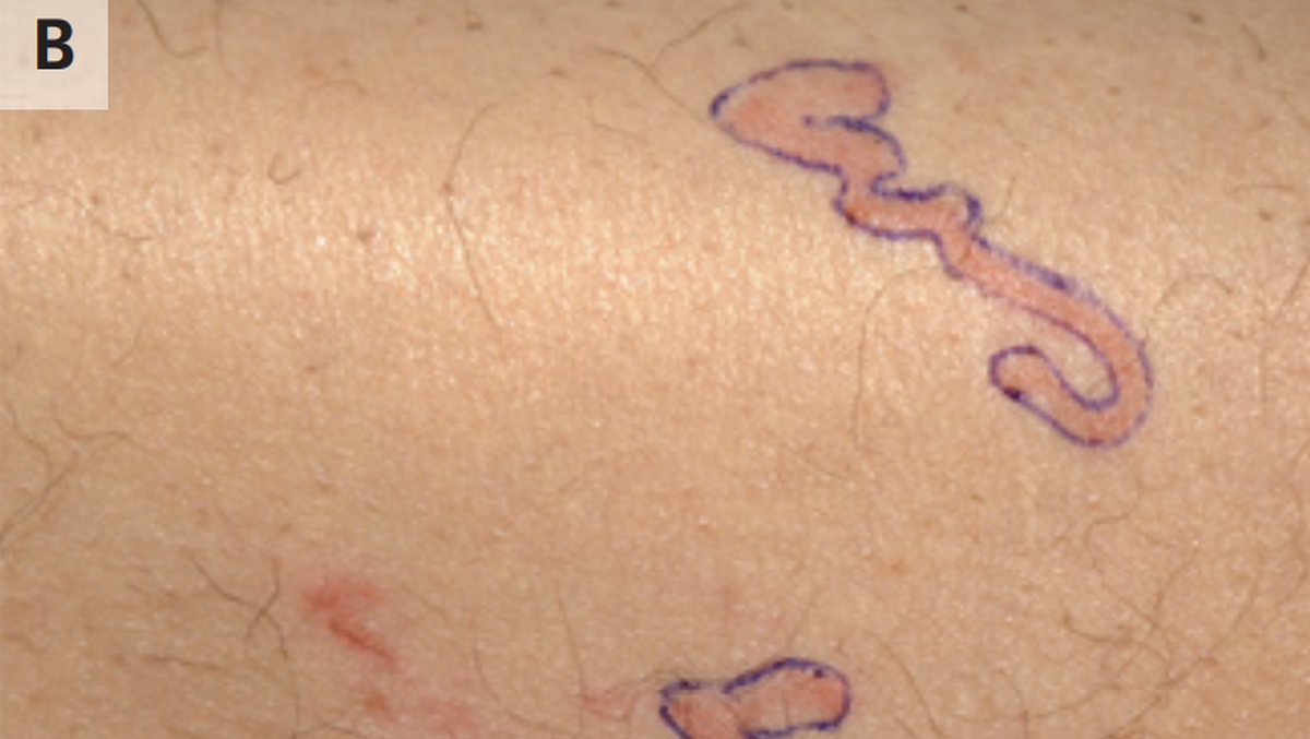 L’éruption cutanée s’est manifestée sous forme de lignes sinueuses sur l’ensemble du corps, débutant au niveau de l’anus avant de se propager rapidement aux membres. Ce qui a alerté les médecins, c’est le caractère dynamique des lésions : en marquant une zone affectée avec un stylo, ils ont constaté que celle-ci avait bougé au bout de 24 heures, indiquant un mouvement sous la peau.