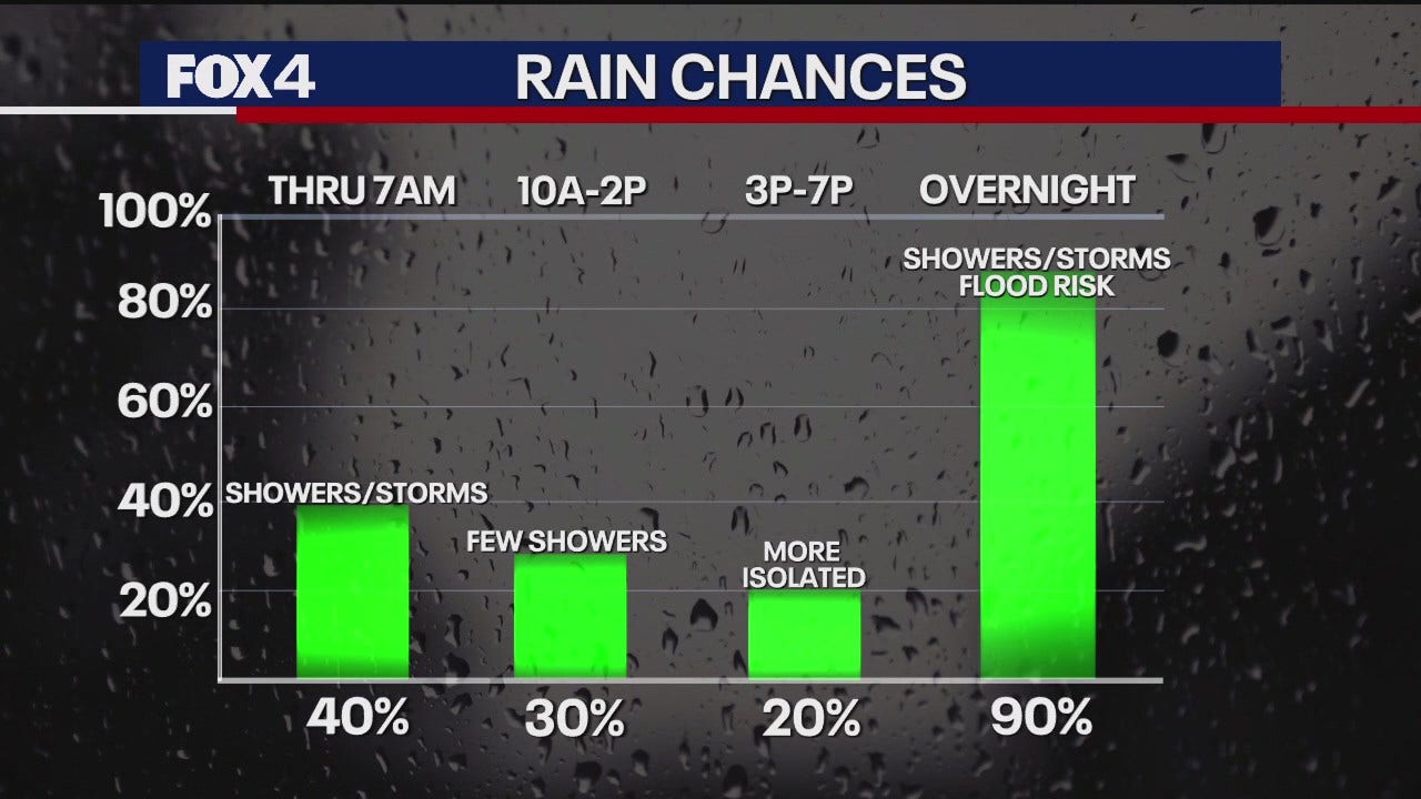 Les conditions météorologiques de ce vendredi se caractérisent par des vents du sud-ouest soutenus et une humidité persistante, avec des températures qui devraient approcher les 27 degrés Celsius (près de 80 °F) dans l’après-midi. Le principal épisode orageux est attendu en soirée. Il devrait débuter après le coucher du soleil dans les secteurs ouest de DFW, et toucher le cœur du Metroplex entre 21h et 22h.