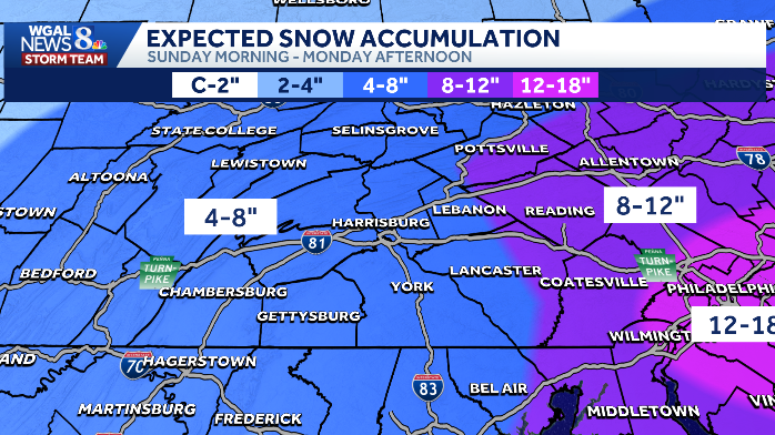 - La vallée de Susquehanna devrait recevoir entre 4 et 8 pouces de neige, avec des accumulations pouvant atteindre 8 à 12 pouces dans certaines parties des comtés de Lancaster, Lebanon et York.