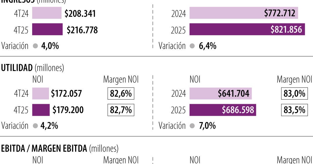 La structure du portefeuille immobilier de Pei se répartit comme suit : 45 % dans le commerce (centres commerciaux et banques commerciales), 35 % dans les entreprises (bureaux), 17 % dans les entrepôts et 7 % dans les actifs spécialisés, incluant l’hôtel de Carthagène, deux résidences universitaires à Bogotá et Cali, et sept centres médicaux en partenariat avec Colsanitas.