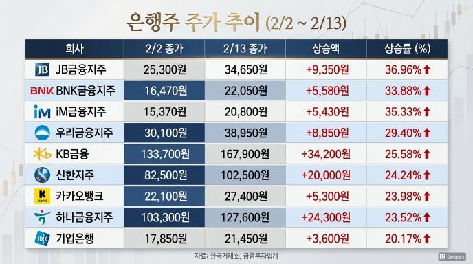 Les actions des banques coréennes sont devenues un moteur de la Bourse de Séoul en février, affichant des performances remarquables. JB Financial Group a enregistré une hausse de près de 37 %, tandis que iM Financial Group et BNK Financial Group ont progressé de 35 % et 33 % respectivement. Les grandes banques, telles que KB Financial Group, Shinhan Financial Group, Hana Financial Group et Woori Financial Group, ont également vu leurs cours augmenter d’environ 20 %, et l’Industrial Bank of Korea et Kakao Bank ont suivi avec des hausses à deux chiffres.