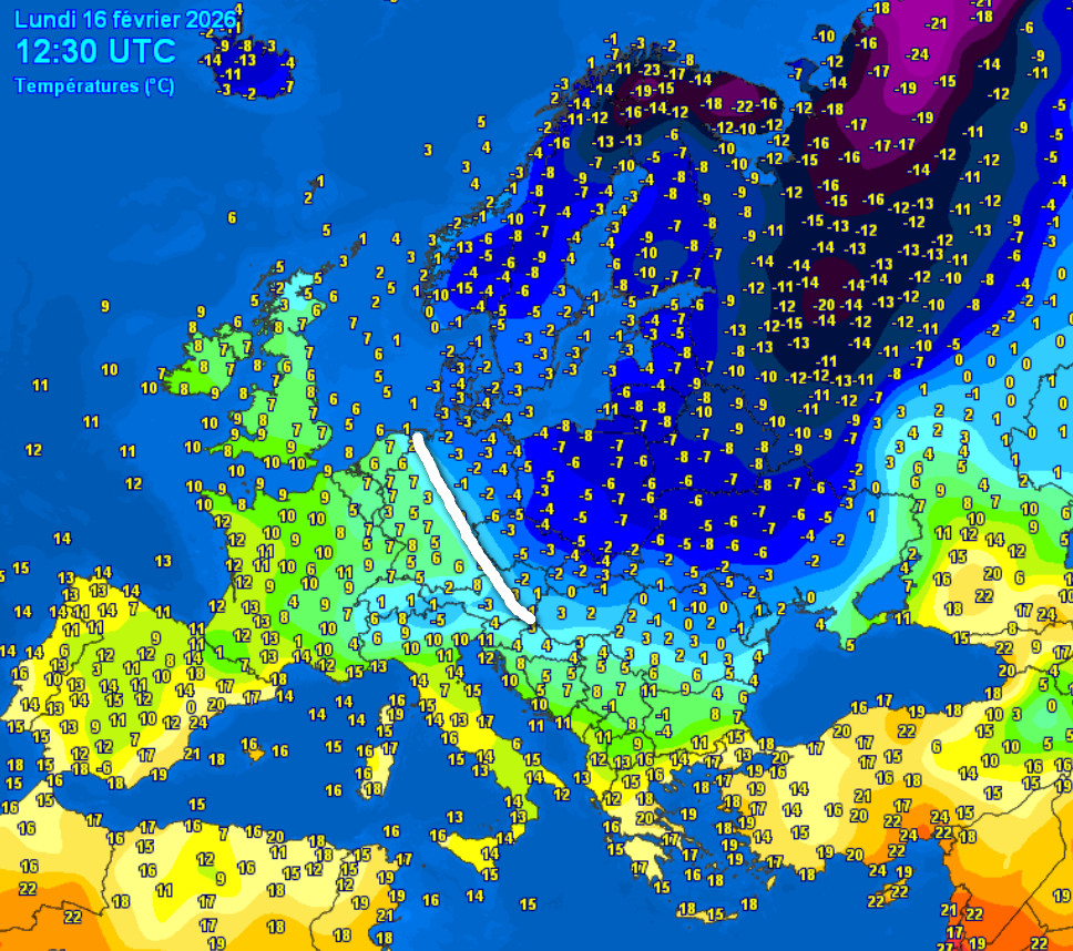 Les températures relevées ce 13 février à 13h30, heure italienne, témoignent d’un refroidissement généralisé. Cette baisse est due à une descente d’air froid qui renforce le gel sur une vaste zone de l’Europe.