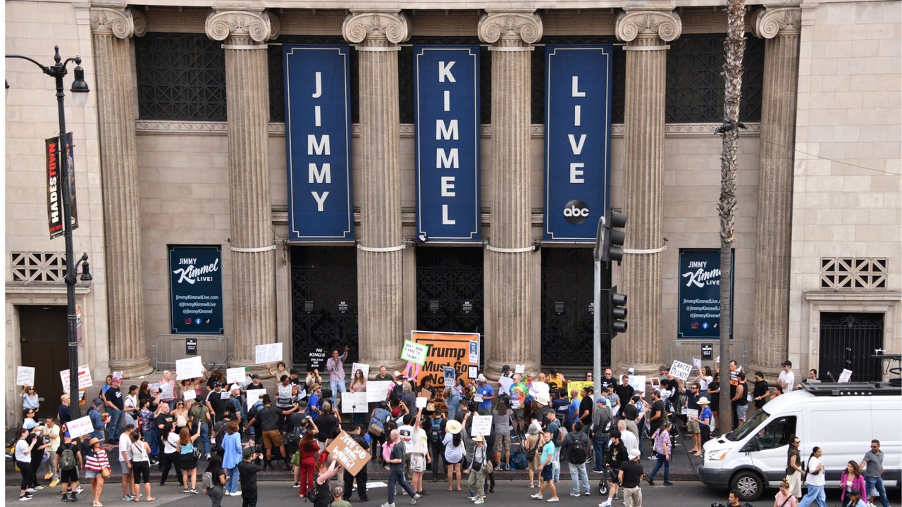 Avec des bannières qui ont dit « Kimmel reste, Trump doit partir», Les manifestants ont dénoncé ce qu’ils considèrent comme une attaque directe contre la liberté d’expression dans le pays.