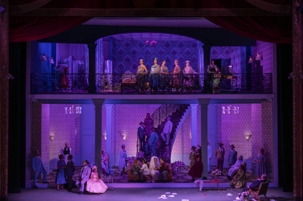 La mise en scène de Vincent Dujardin, avec les décors et costumes de Leila Fteita, ancre l’opéra dans une esthétique soignée des années 60. L’environnement visuel, conçu comme une maison en deux niveaux superposés, facilite les interactions et les rebondissements. Les costumes d’époque, rehaussés d’un look rockabilly pour les amants déguisés, contribuent à l’atmosphère ludique et trompeuse de la pièce.